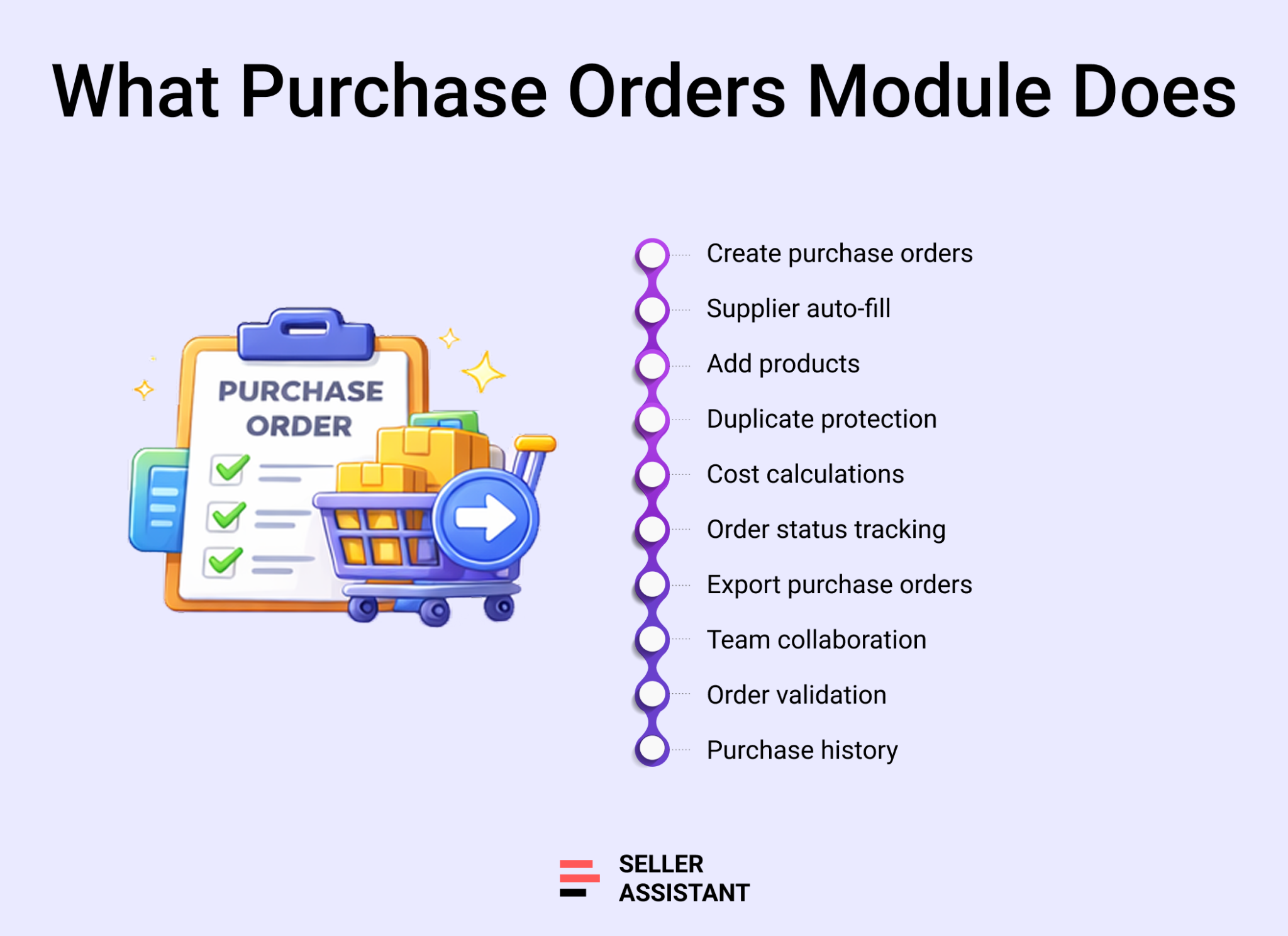 В этой статье объясняется, как работает модуль, и пошагово показано, как создавать, управлять и экспортировать заказы на покупку в Seller Assistant.