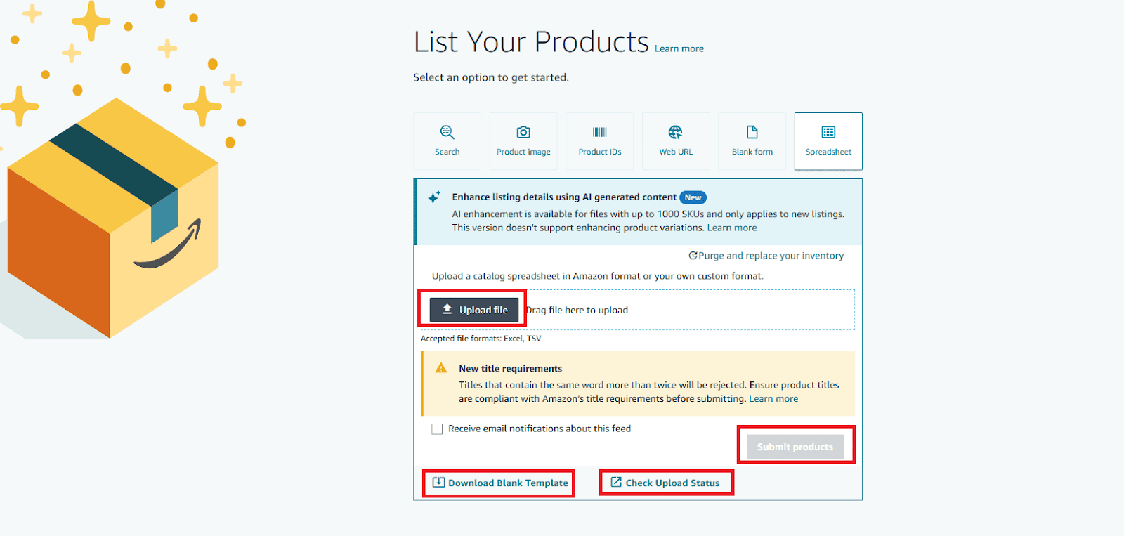 - Choose SKUs from your inventory list or upload them in bulk using a flat file.