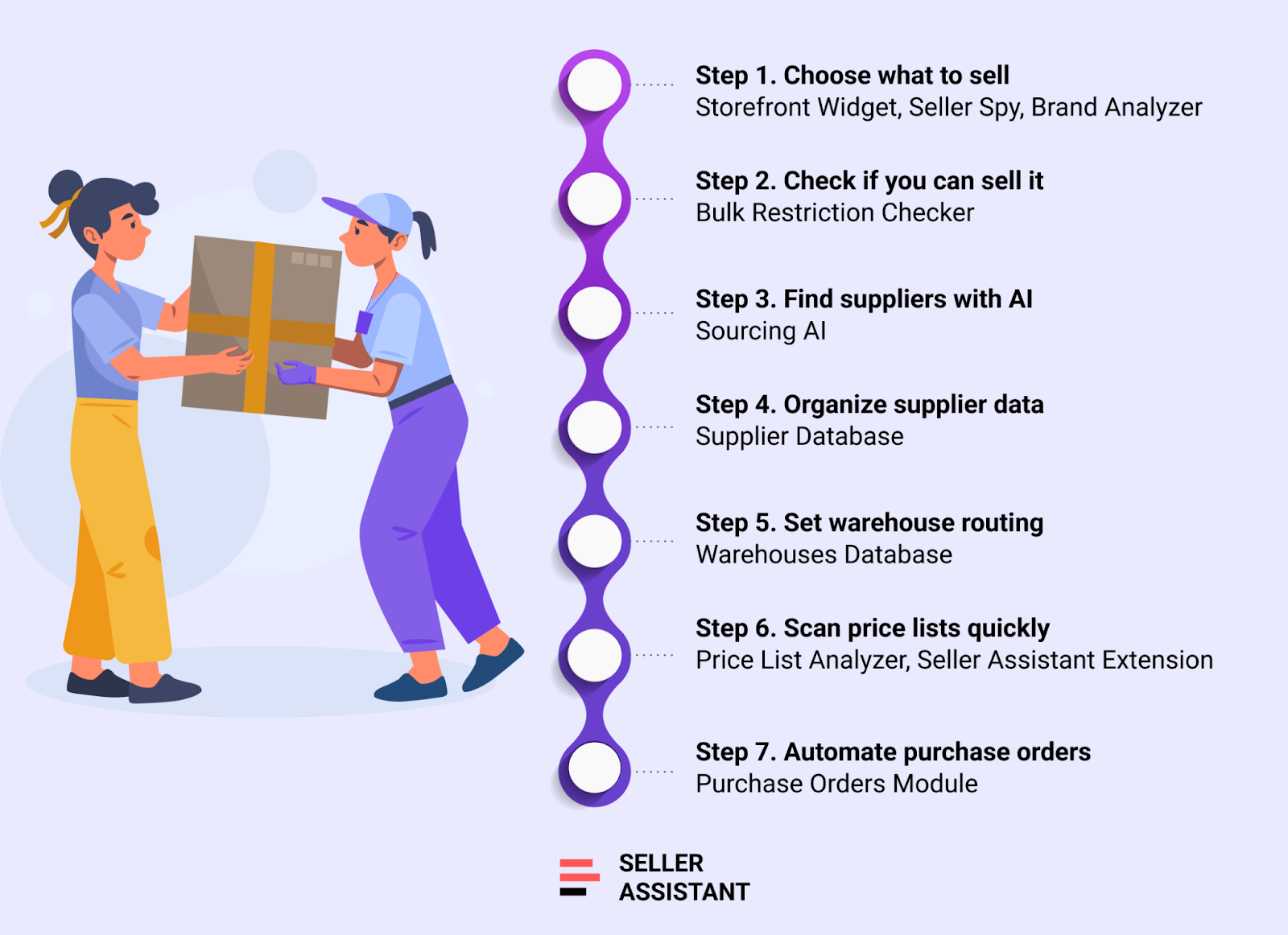 Note. Seller Assistant is an end-to-end Amazon workflow management platform that integrates 10+ wholesale-focused solutions into one connected system. It combines workflow automation, bulk research, sourcing intelligence tools, and integrated Chrome extensions – giving you everything you need to streamline product sourcing, supplier management, and purchase order creation.