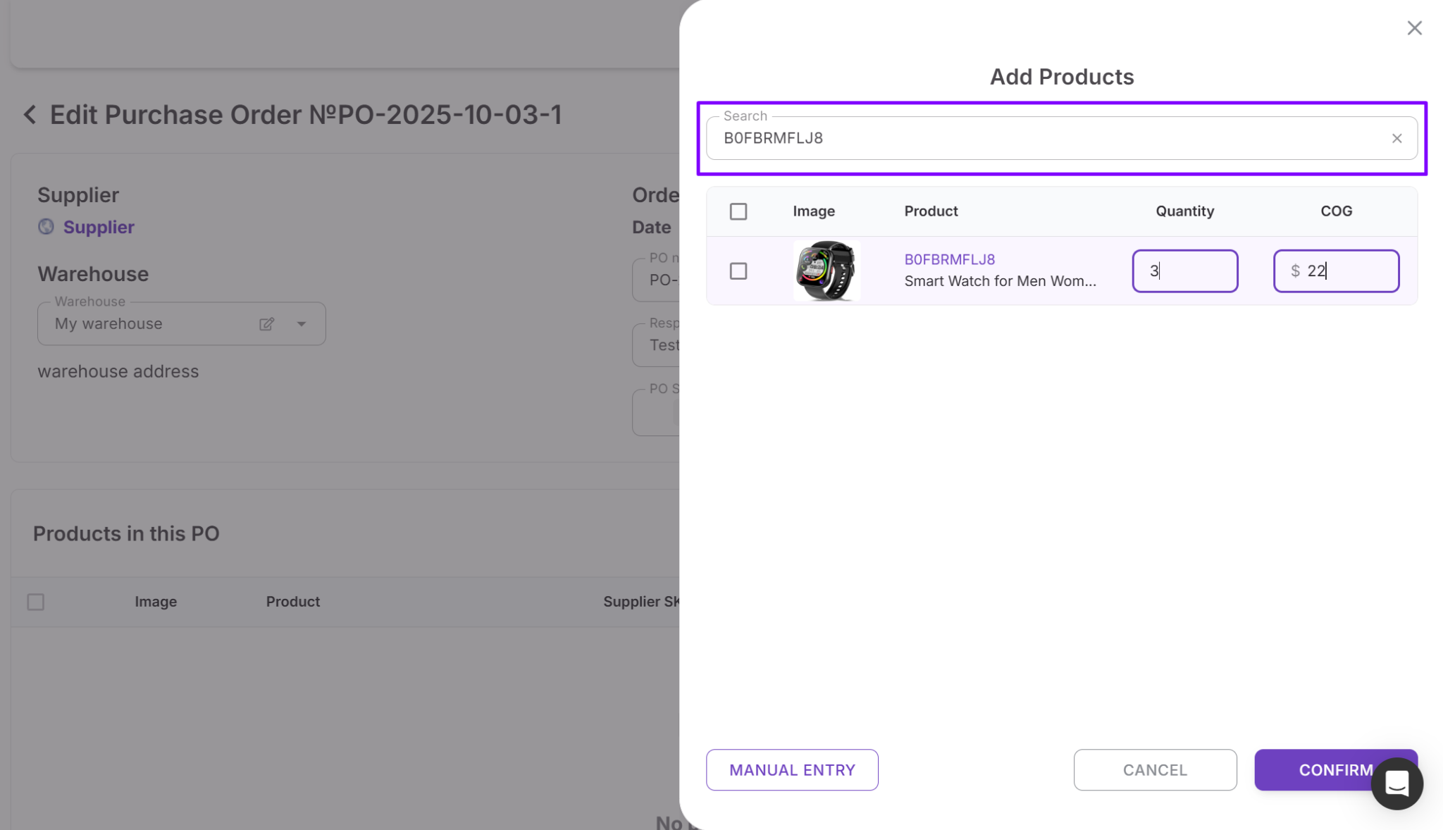 Click Create PO, select an existing supplier or create a new one, and confirm. A draft PO opens with a unique number and pre-filled supplier details.