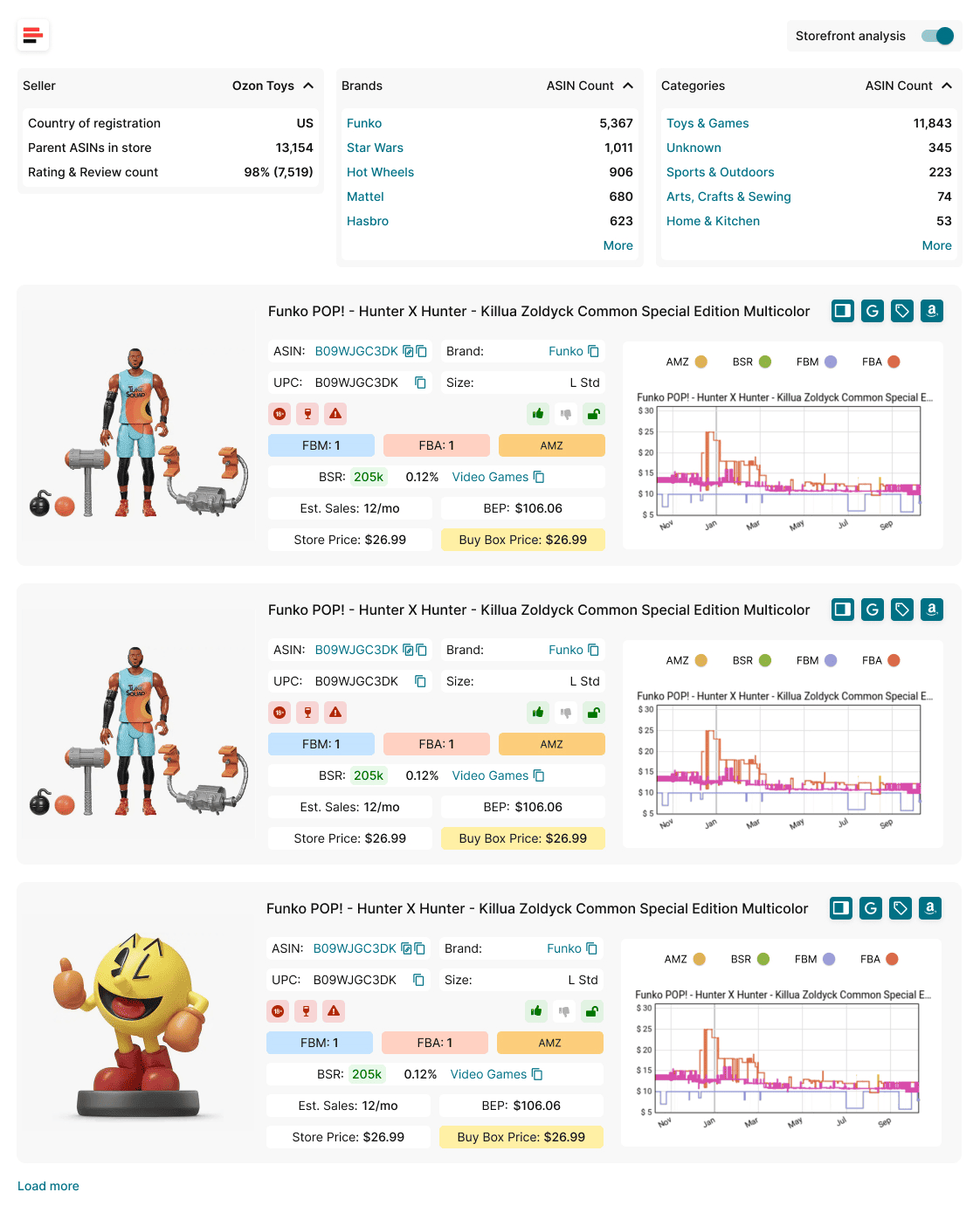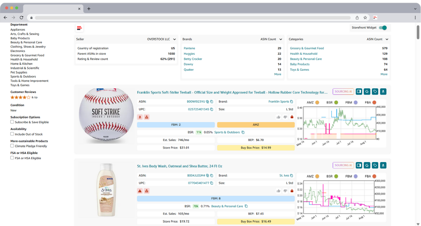 Successful sellers already carry brands that work well on Amazon, so analyzing their storefronts reveals proven opportunities. The Storefront Widget helps you quickly identify which brands appear consistently and perform well.