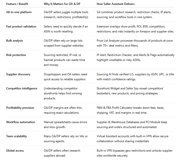 Yes – Seller Assistant is built for both. OA sellers can scan bulk product lists and supplier websites, while dropshippers can use tools like Sourcing AI and competitor analysis to expand their catalogs.