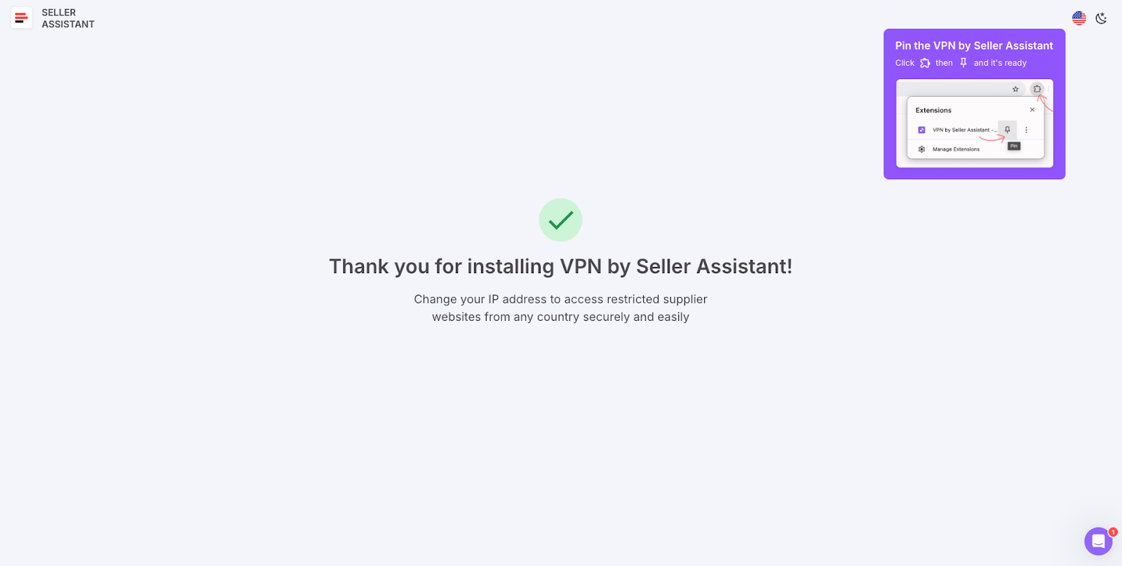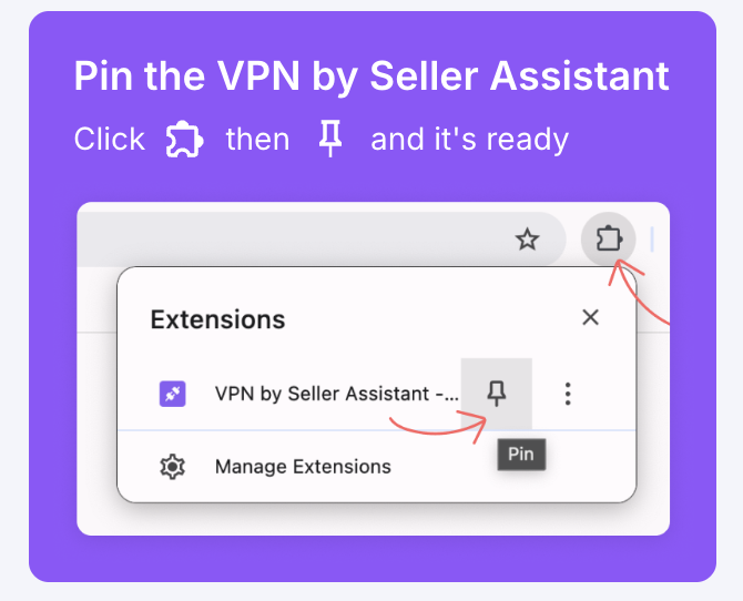 Once the extension is pinned, you can activate VPN by Seller Assistant with one click.