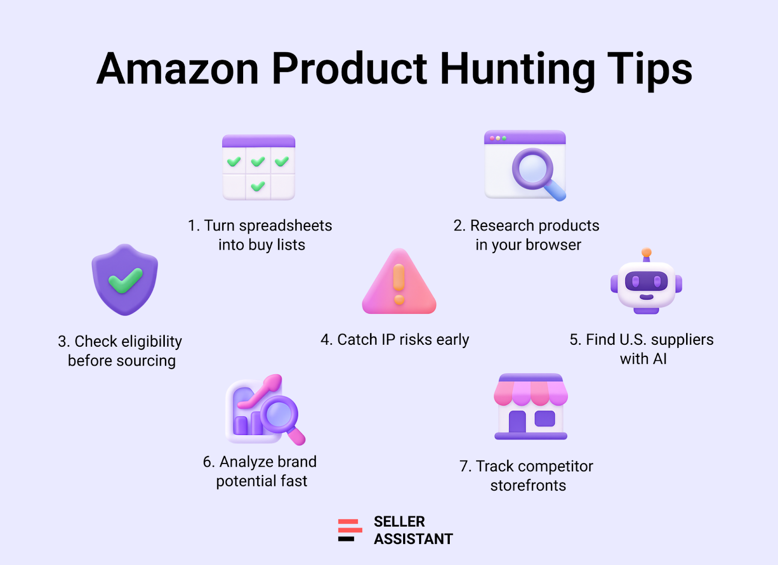 En esta publicación, cubriremos 7 potentes consejos para la búsqueda de productos en Amazon diseñados específicamente para vendedores de venta al por mayor, arbitraje en línea y dropshipping. Cada consejo resuelve un desafío real de abastecimiento utilizando una herramienta específica de Seller Assistant, una plataforma todo en uno que optimiza todo tu flujo de trabajo de búsqueda de productos.
