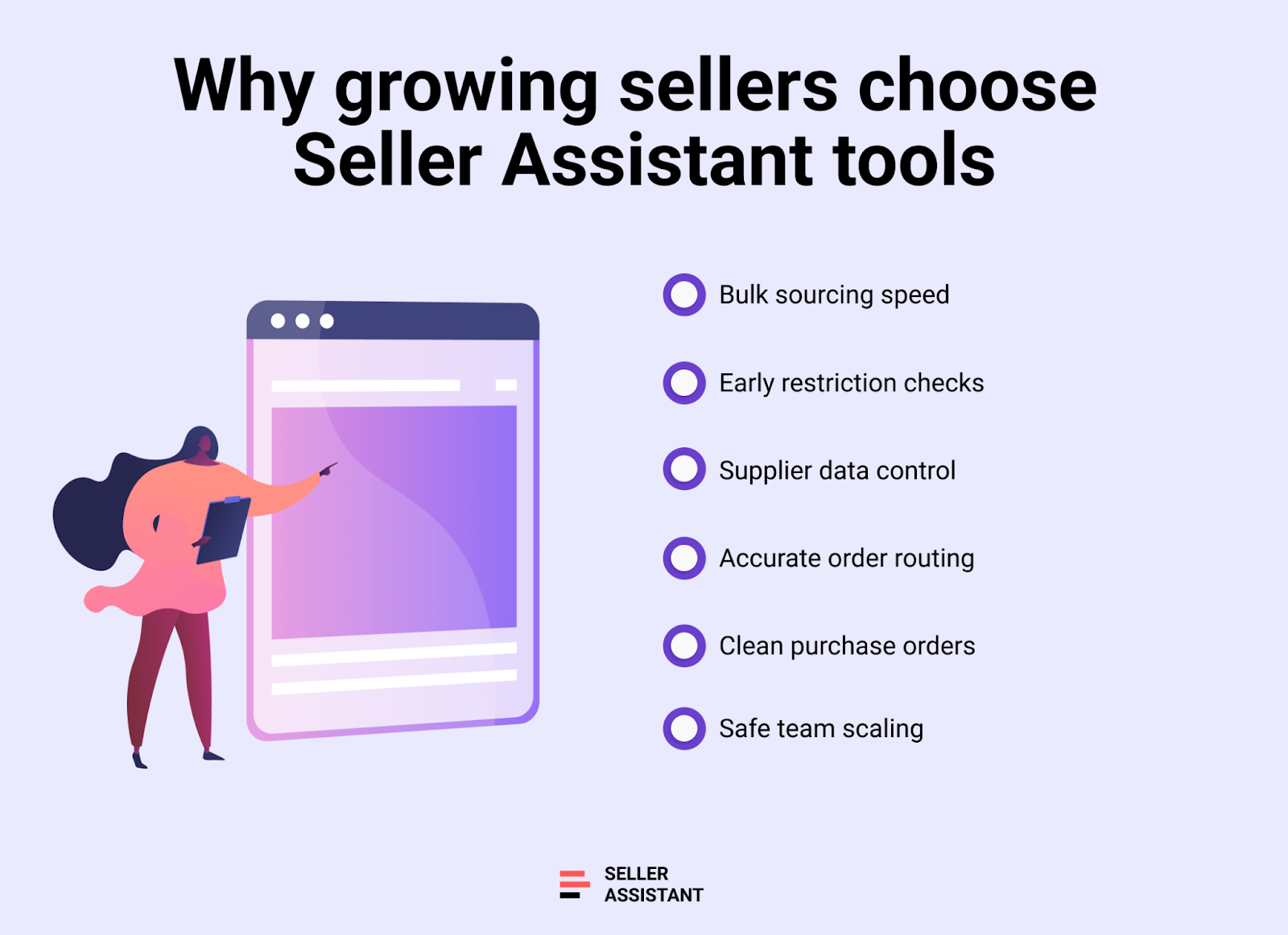 Las herramientas de flujo de trabajo de Seller Assistant convierten el abastecimiento, las comprobaciones de elegibilidad, la gestión de proveedores, la logística y las compras en un único proceso conectado. Cada herramienta resuelve un problema específico, pero juntas crean un flujo de trabajo repetible y escalable que reduce el riesgo y ahorra tiempo.