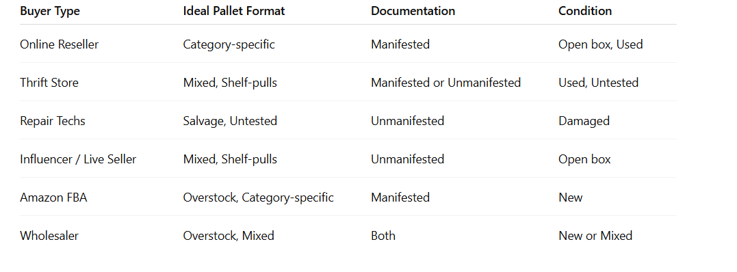 Los revendedores en línea prosperan con un inventario predecible que pueden listar rápidamente. Los palés con manifiesto y las cargas de una sola categoría reducen las sorpresas y simplifican la fijación de precios. Plataformas como eBay también permiten la venta de artículos de caja abierta y poco usados.