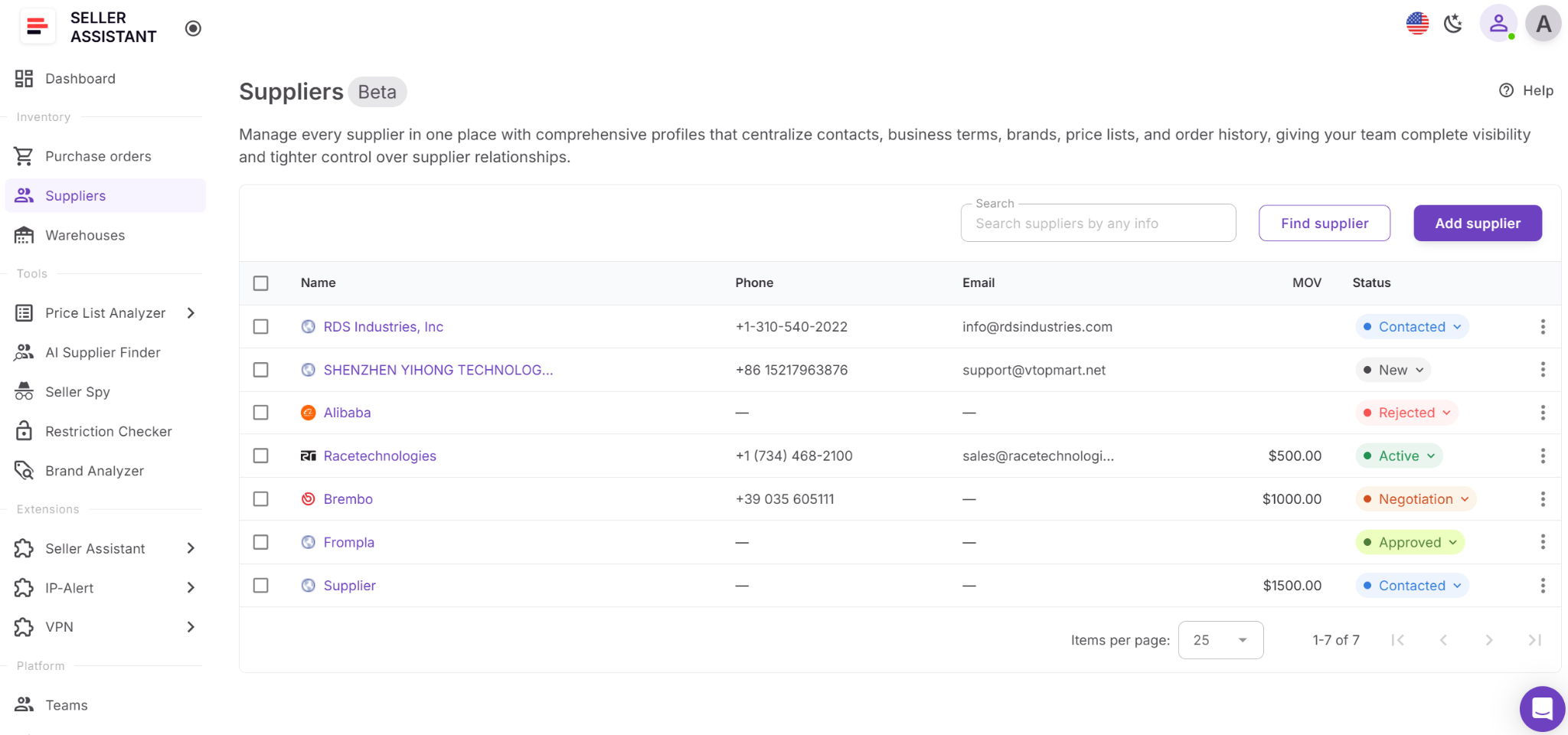 Como los datos de los proveedores fluyen automáticamente entre las herramientas, los vendedores evitan la introducción repetida de datos y mantienen la coherencia de su flujo de trabajo de abastecimiento. Dentro del ecosistema mayorista de Seller Assistant, que incluye herramientas de investigación masiva, bases de datos de proveedores y almacenes, extensiones de Chrome y gestión de órdenes de compra, la base de datos de proveedores actúa como la capa de gestión de proveedores que conecta la investigación de abastecimiento con la ejecución de la compra.