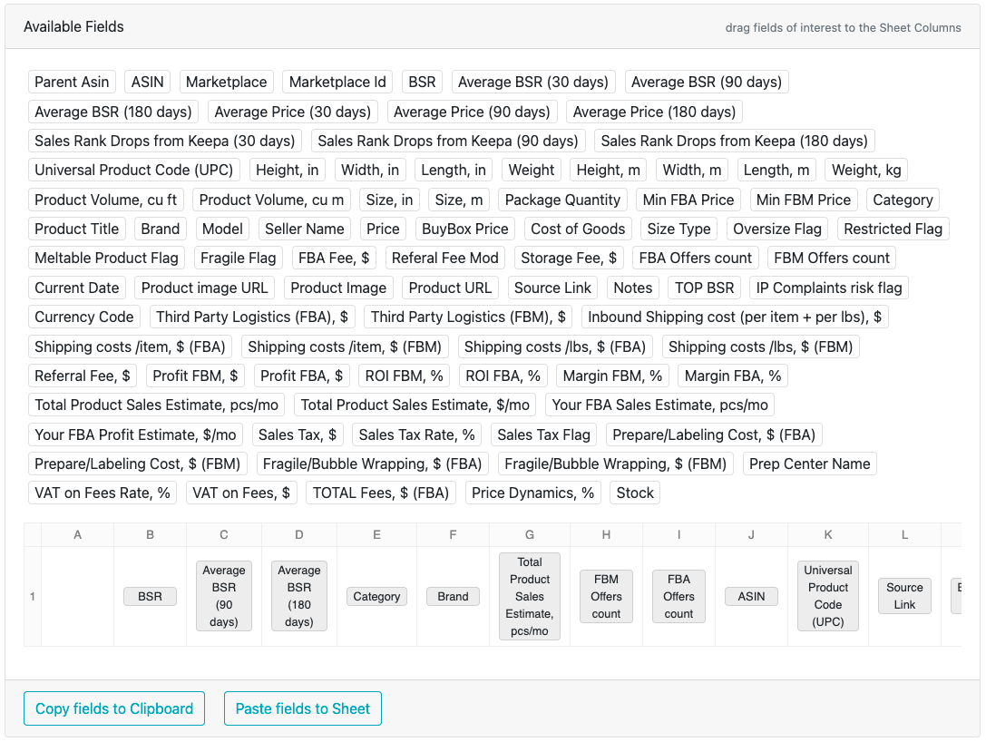 При выборе доступных полей экспорта в настройках плагина разбегаются глаза. Мы добавляем сразу все поля, которые могут понадобиться при Онлайн Арбитраже. Думаю, лучше в дальнейшем скрыть неиспользуемые столбцы, чем постоянно возвращаться к настройкам полей экспорта. Например, в прилагаемом файле скрыты столбцы “Profit FBM” и “Your FBA Profit” из-за того, что ведется поиск сделок только для продажи через FBA. И если появится задача поиска FBM сделок, то столбцы можно легко развернуть.