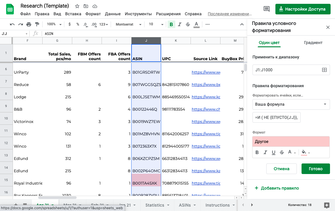 Примерно на третьем месяце работы мы столкнулись с проблемой повторного добавление вилок. Пришлось реализовать подсветку дублей с помощью условного форматирования. Также проблема частично решена в Seller Assistant App новой функцией сохранения заполненных полей на обработанных листингах. По мере работы у нас появлялись новые задачи. И сейчас список основных доработок таблиц ресерча примерно следующий: