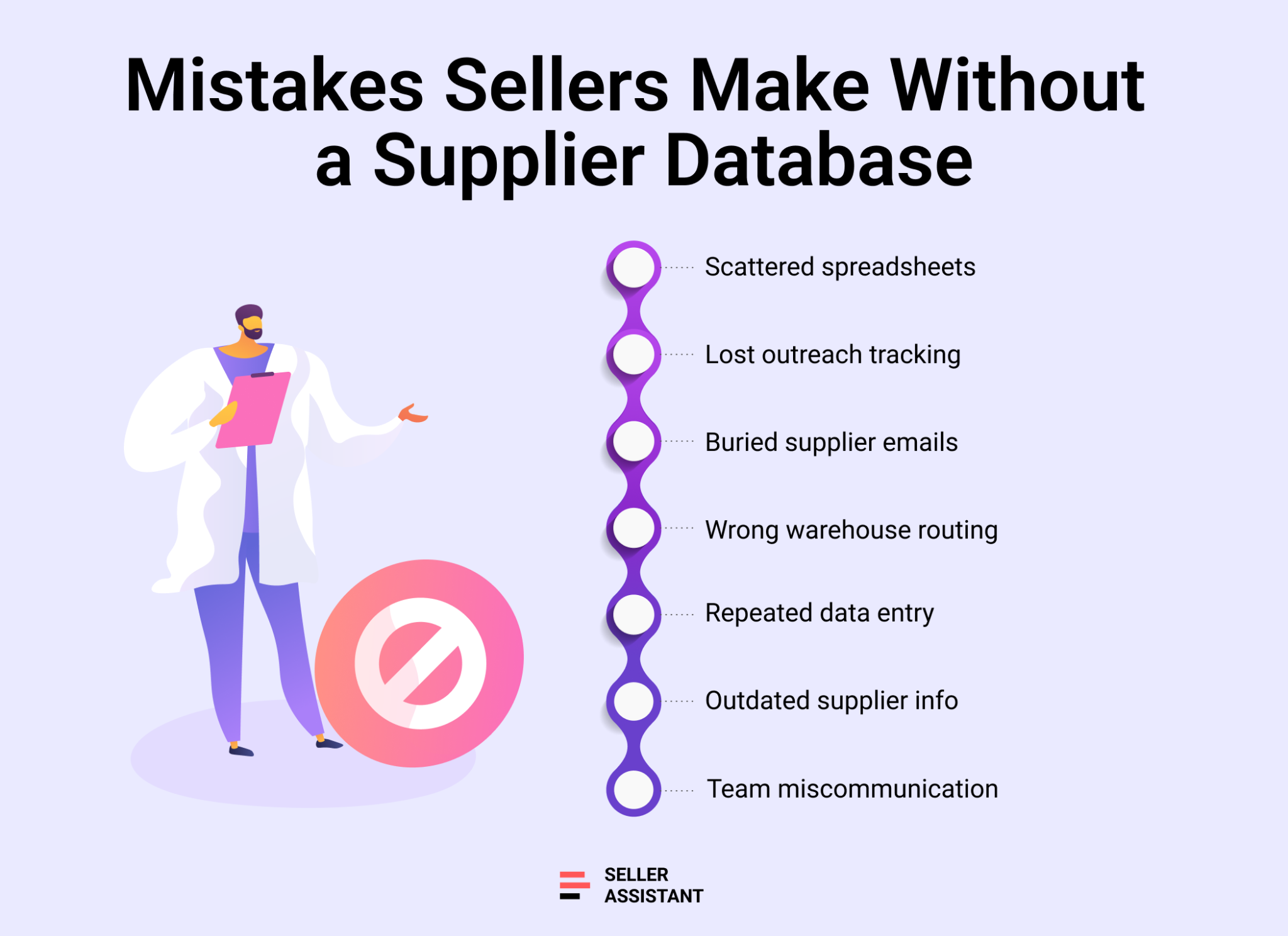 Когда продавцы начинают связываться с поставщиками, все кажется управляемым — до определенного момента. Как только вы начинаете жонглировать десятками электронных писем, разрозненными таблицами, меняющимися минимальными объемами заказа (MOV) и несколькими центрами подготовки , дезорганизация начинает стоить реальных денег . База данных поставщиков предотвращает эти потери. Вот самые распространенные ошибки, с которыми сталкиваются продавцы, пытаясь вести оптовые операции без структурированной системы.