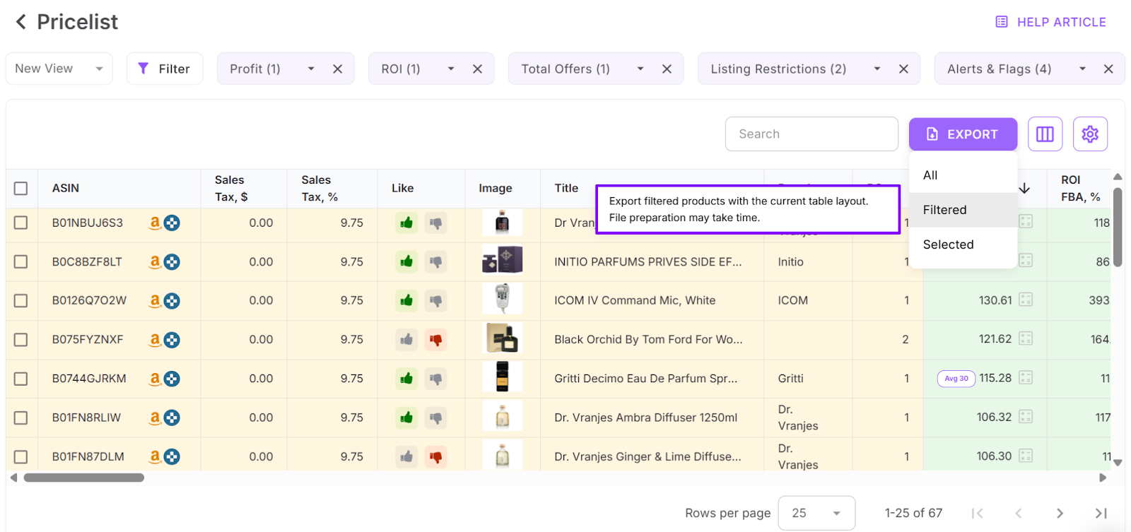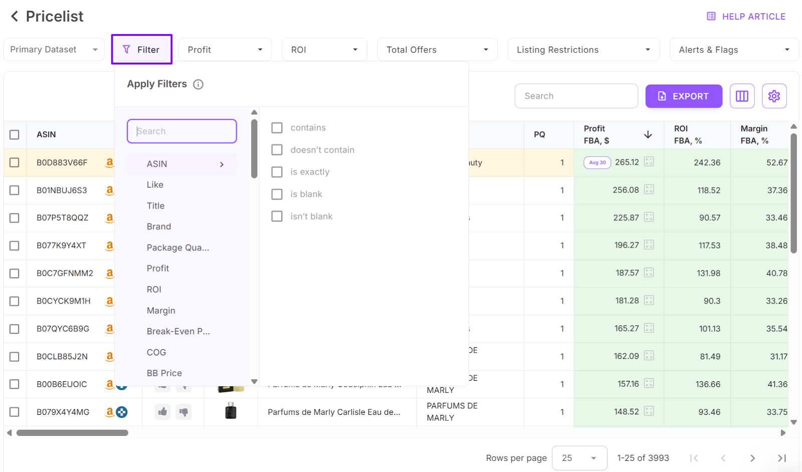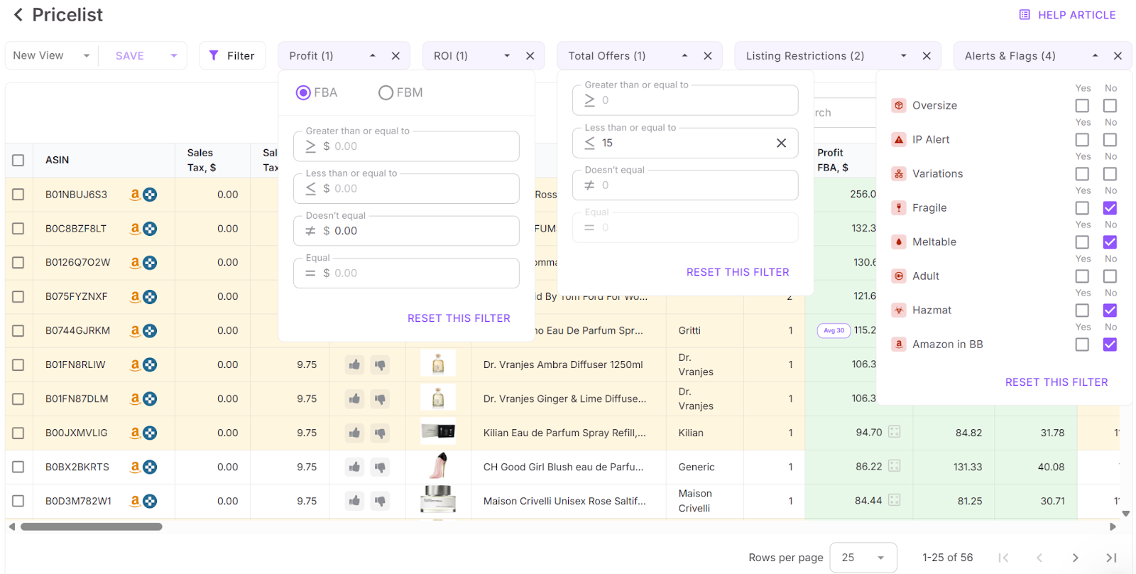 Применять гибкие фильтры по прибыльности, производительности или риску, чтобы быстро сузить круг выигрышных товаров. Сохраняйте свои пользовательские макеты и фильтры для повторного использования с будущими прайс-листами.