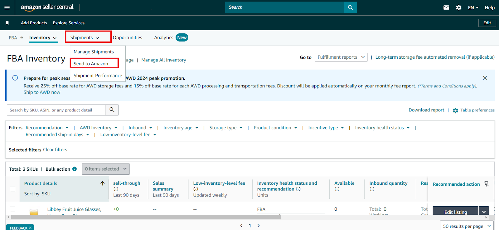 Войдите в Seller Central и перейдите в раздел «Инвентарь» > «Инвентарь FBA» чтобы найти продукты, которые вы хотите отправить.