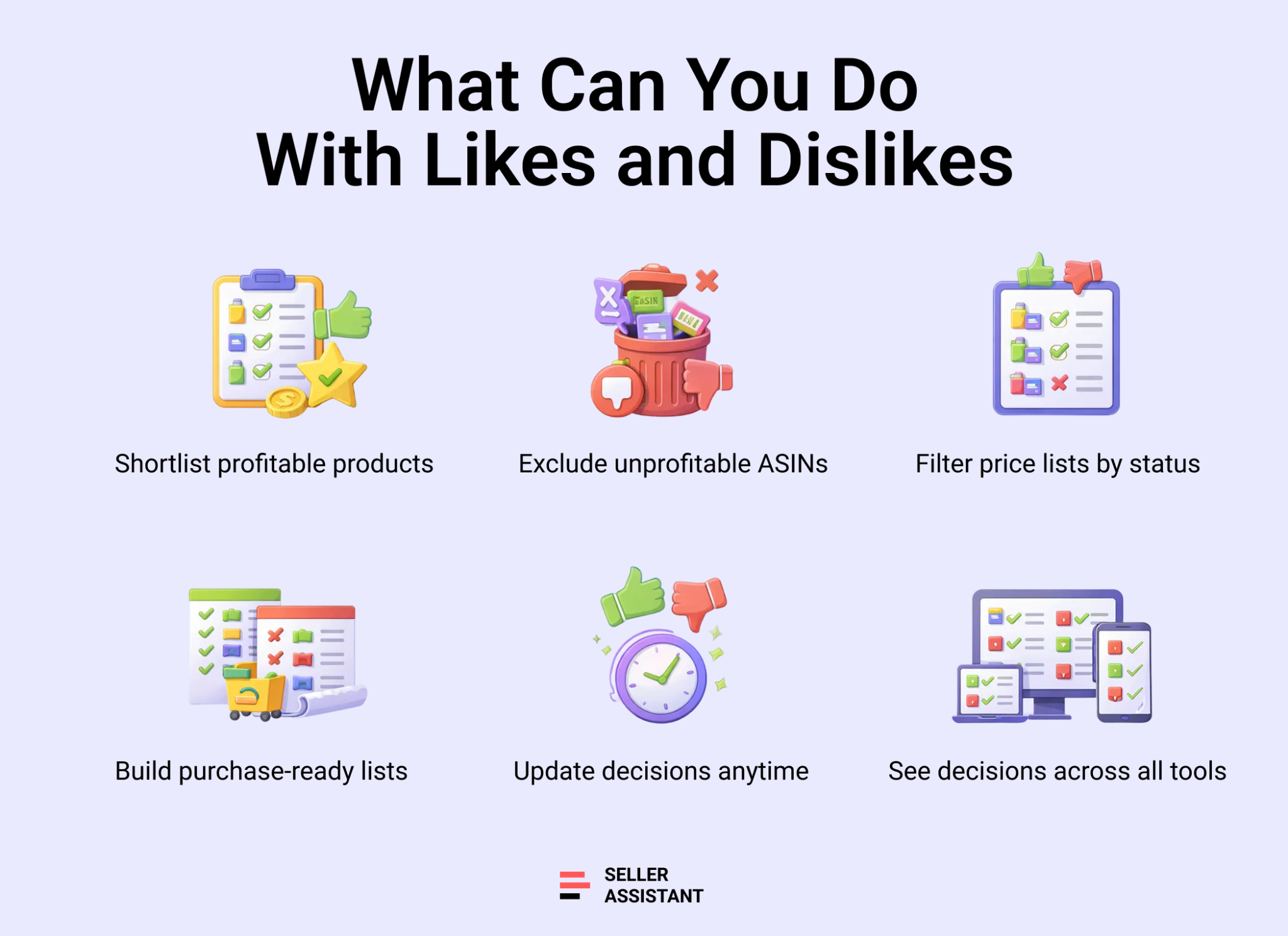 Лайки и дизлайки в Seller Assistant’s Price List Analyzer решают эту проблему, превращая выбор товаров в масштабируемый, повторяемый процесс. Вместо того чтобы полагаться на память или заметки, разбросанные по электронным таблицам, вы можете отметить товары один раз и использовать эти решения каждый раз, когда ASIN появляется снова — будь то в новом прайс-листе или во время ручного исследования.