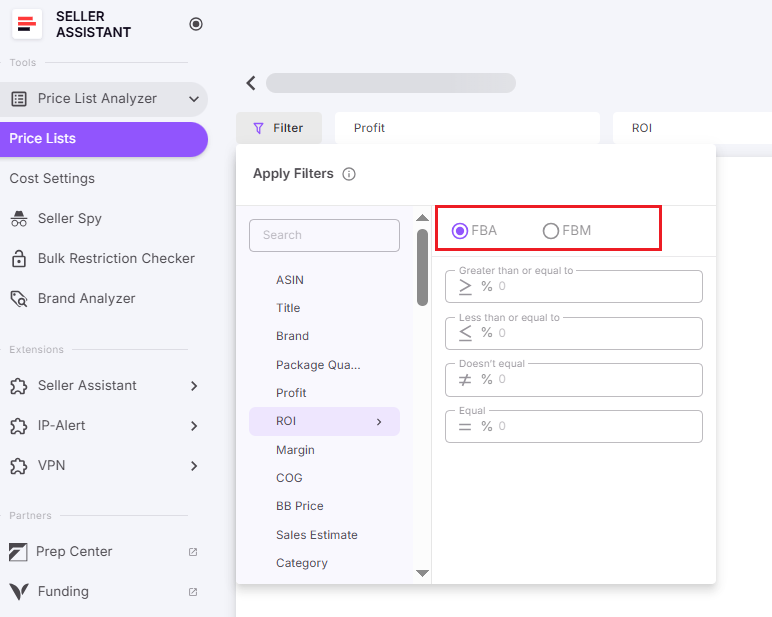 В верхней части прайс-листа получите доступ к фильтрам быстрого доступа для высокоприоритетных индикаторов, таких как прибыль, ROI, количество предложений, оповещения и флаги, а также ограничения на листинг.
