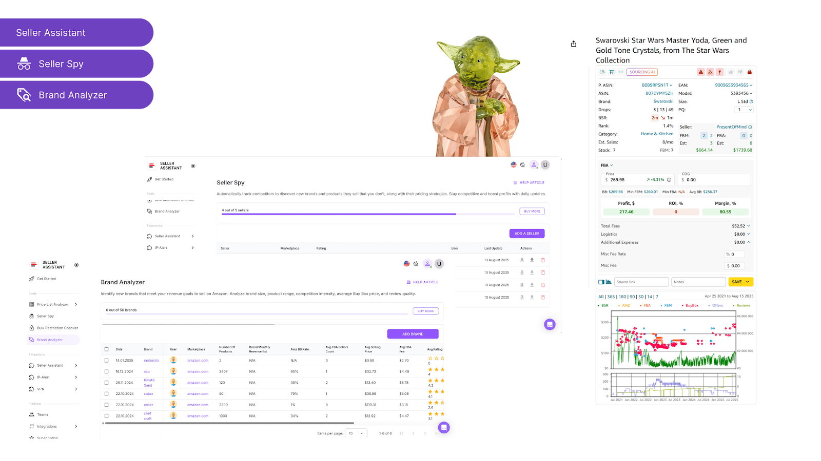 Platform şunları bir araya getirir: iş akışı yönetim araçları – Satın Alma Siparişleri Modülü, Tedarikçi Veritabanı, Depo Veritabanı toptan ve arbitraj operasyonlarınızın her adımını organize etmek, otomatikleştirmek ve ölçeklendirmek için; toplu araştırma ve tedarik araçları – Price List Analyzer, Bulk Restriction Checker, Sourcing AI, Brand Analyzer, Seller Spy tedarikçi fiyat listelerini değerlendirmek, satış uygunluğunu ve kısıtlamaları doğrulamak, yeni markalar açmak ve ürün kataloğunuzu genişletmek için rakiplerden kazanan ürün fikirleri keşfetmek için; Chrome uzantıları – Seller Assistant Tarayıcı Uzantısı, IP-Alert Extension, ve dahili VPN by Seller Assistant ürünleri derinlemesine araştırmak, IP iddialarını ve uyumluluğu kontrol etmek ve coğrafi olarak engellenen tedarikçi sitelerine doğrudan tarayıcınızdan erişmek için; ve entegrasyonlar ve ekip erişim özellikleri – sorunsuz API bağlantısı ve Zapier, Airtable ve Make ile entegrasyonlar, ayrıca Sanal Asistan Hesapları güvenli, ölçeklenebilir ekip işbirliği için.