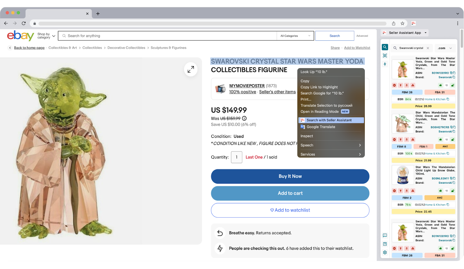 Tedarikçi web sitesinde, ürün başlığını seçerek, sağ tıklayarak ve içerik menüsünden “Satıcı Asistanı ile Ara” seçeneğini seçerek Yan Panel Görünümünü etkinleştirin. Araç daha sonra Amazon'daki tüm ürün tekliflerini gösterecektir. Anahtar metrikler. Araştırmak istediğiniz ürünü seçin.